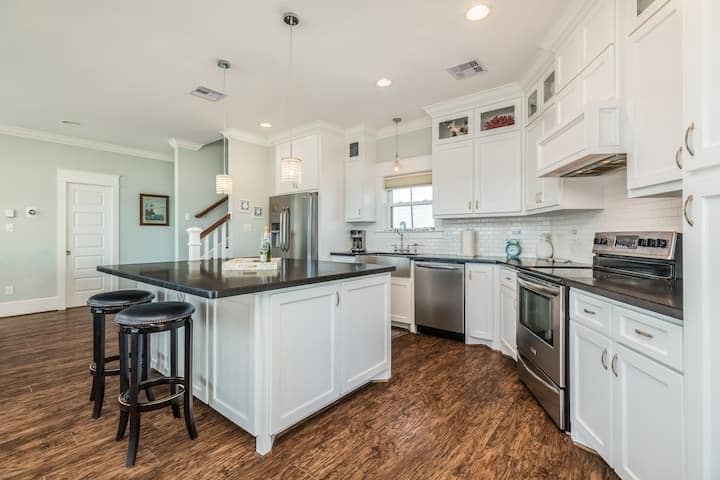 NYTT byggnadsprojekt vid stranden! Verkligen en unik egendom:🦄 LÄGE, LYX och så trevligt att ha NYTT! Beläget några steg från de bästa restaurangerna och stranden i Surfside! Njut av hängmattor och spel under huset. Klättra uppför trappan till ett fantastiskt skuggat däck med utsikt från San Luis Pass hela vägen till bryggan! Mer än 180 graders fri utsikt. Sovrum öppna till soldäck och stjärnskådning med 🔥 eldstad YouTube Beachfront Luxe för video 125 USD i städavgift och endast 75 USD totalt för upp till 2 husdjur för hela vistelsen!