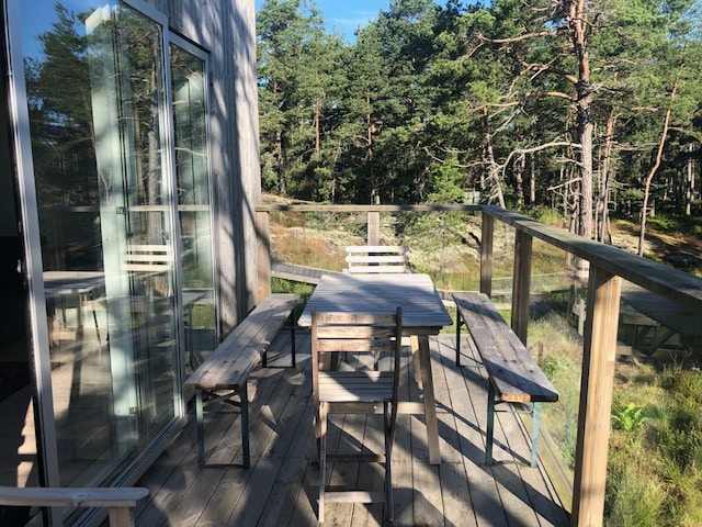 Med urskogen i ryggen och fjärden framför ögonen vaknar du i detta magiska hus högt upp på en klippa i Skärgården. Huset i sig har allt man behöver. men det är naturen runt omkring som ger magin. Här möter urskogen den karga skärgårdnaturen. Med milsvidd utsikt över Jungfrufjärden kan man inte annat än abdikera för lugnet. De stjärnklara nätterna och tystnaden längst ut på halvön är godis för själen. Med havsörn och rådjur utanför fönstret mjuknar man inifrån och ut. En unik plats helt enkelt.