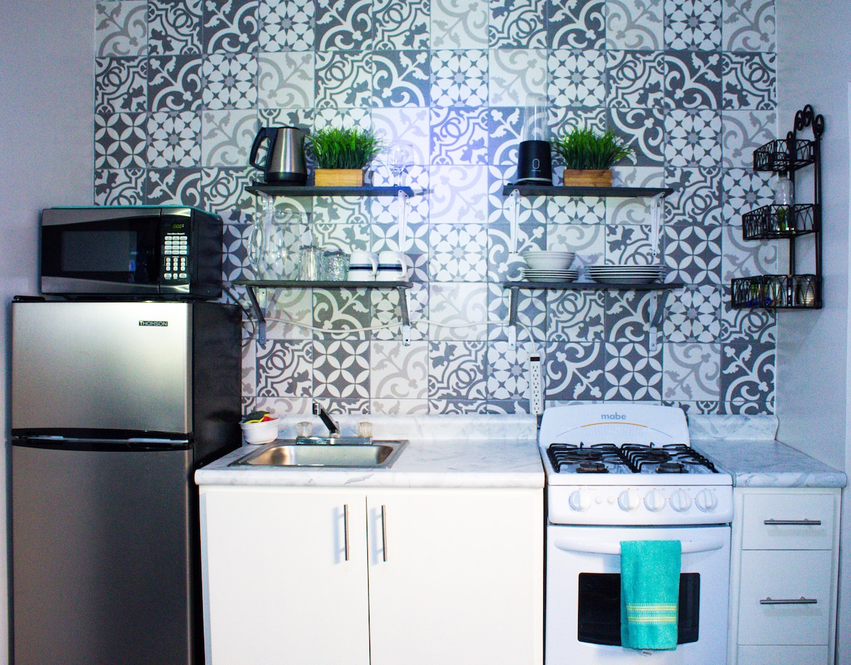 Studio med dubbel queen-size*Fullt utrustat kök*75" TV*Tvättmaskin/Torktumlare*Regndusch