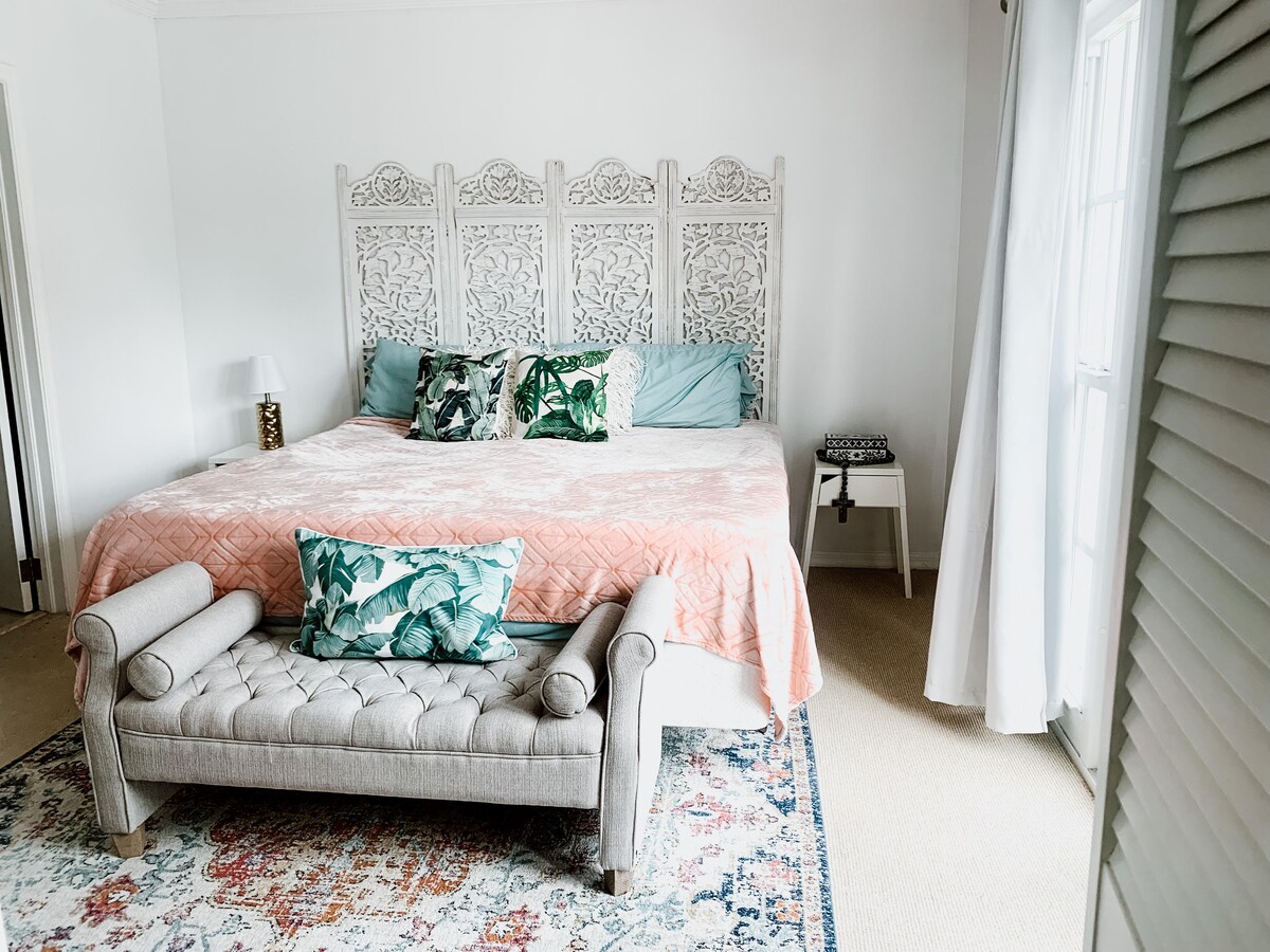 Välkommen till den charmiga stugan "French 75" i Nassau, Bahamas!🌴 Beläget bredvid poolen och bara en minuters promenad från stranden är det idealiskt för en romantisk semester. Gästerna har tillgång till Pink Palms gemensamma pool och utomhusutrymmen. Boendet inkluderar också tre ytterligare stugor och ett huvudhus, som kan bokas tillsammans eller separat för större grupper eller extra avskildhet. Observera att det pågår ett byggnadsarbete intill, och att det ibland kan höras buller utomhus under dagtid.