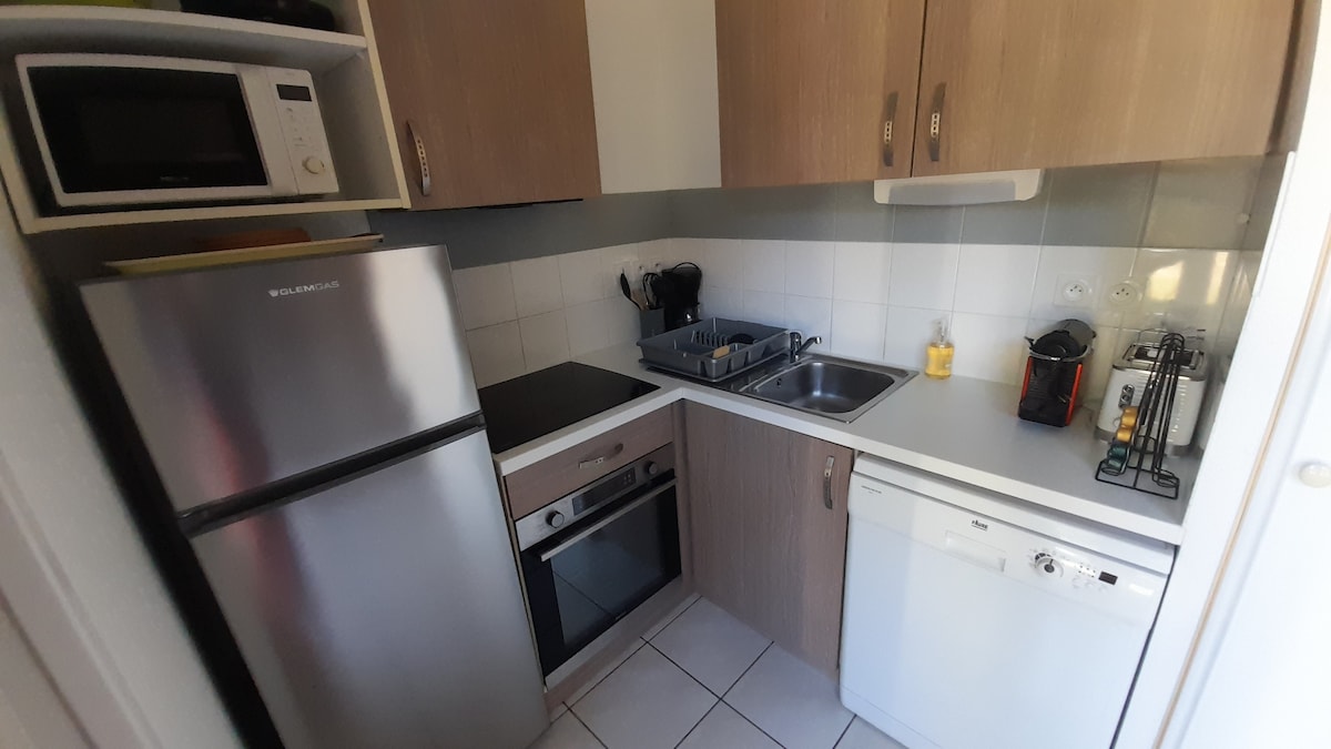 T1 Bis på 33 m2 i en hotellbostad som du kommer att uppskatta för dess lugn och dess närhet till flygplatsen. Perfekt för par och familjer. Spårvagnen mittemot tar dig på två stationer till flygplatsen (eller 20 minuter till fots) och i den andra riktningen direkt till Bordeaux centrum (30 minuter). Renoverad, rökfri lägenhet som rymmer 4 resenärer. 1 säng och en 140 cm bäddsoffa med madrass i vardagsrummet. Te, kaffe tillgängligt, sängkläder ingår Tillgång till pool på sommaren