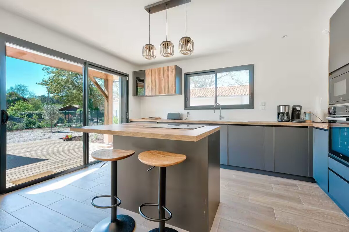 Maison neuve, climatisée et chaleureuse. Elle a été classée "meublé tourisme 5 ETOILES". Très confortable et lumineuse, tout a été pensé pour votre séjour jusqu'aux lits faits à l'arrivée. Ménage, serviettes, tapis de douche, torchons sont prévus. Proche commerces et centre ville, plages à 800 mètres et océan à 20 min. Idéal famille. Aire de jeux enfants. Stationnement gratuit et clos.