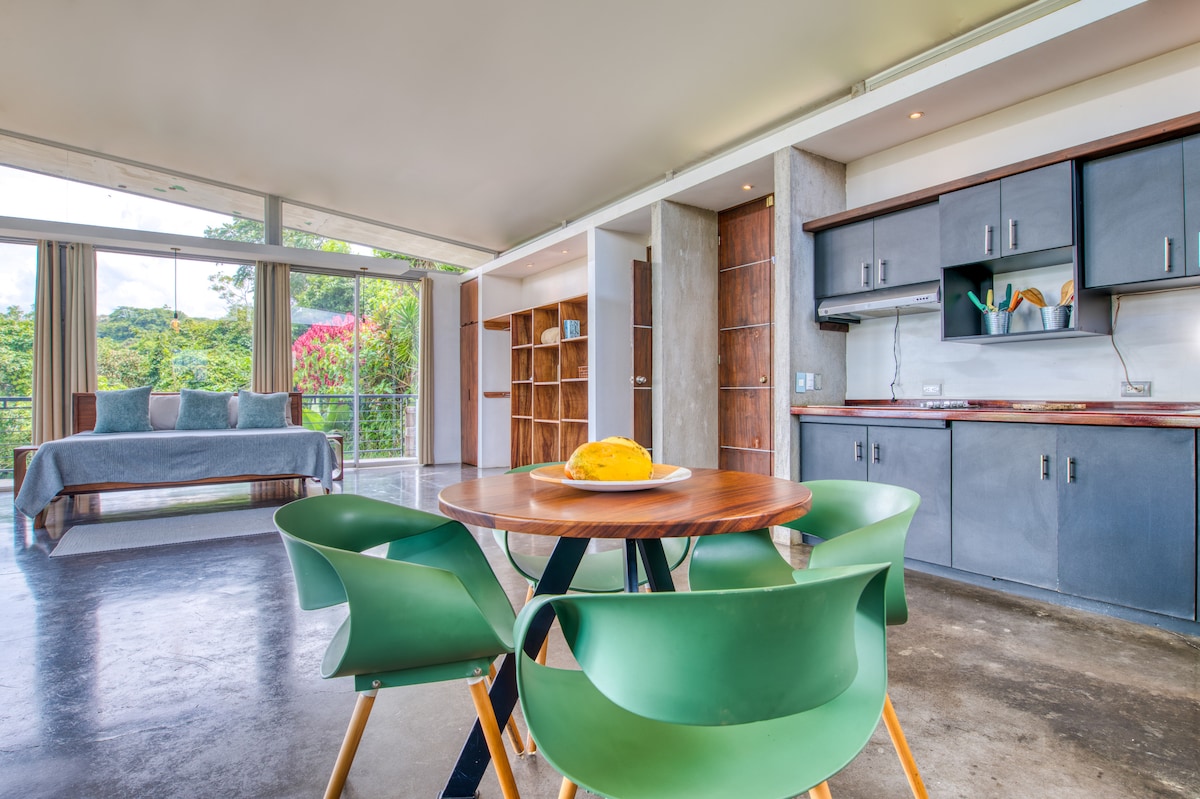 Denna livliga, moderna 600 SF loft-stil casita äger några av de mest spektakulära utsikterna i Costa Rica från sin privata terrass. Det noggrant utformade utrymmet har otaliga bekvämligheter för varelser och var utvalda med uppmärksamhet på detaljer i sinnet. Allt är helt nytt och av hög kvalitet. Supersnabbt WIFI och ett stående skrivbord ger arbetsresenärer en idealisk uppsättning. Det fullständiga köket är exakt utrustat med allt du behöver för att äta bra under din vistelse. Även duschen har en svepande utsikt.