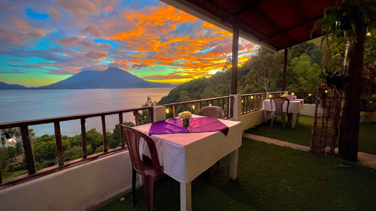 Slappna av i denna fridfulla villa med fantastisk utsikt över Atitlánsjön med tillgång till stranden. Det stora vardagsrummet har bekväma soffor, HD-TV och en stor balkong. Det finns ett rymligt, fullt utrustat kök. Sovrummen har privata balkonger och badrum. Sovrummen har bekväma, fräscha sängkläder och kuddar så att du kan sova lugnt. Det stora badrummet har en kombination av walk-in dusch och badkar. Villan har rena/vita handdukar. Var beredd på ett unikt och lugnt boende.