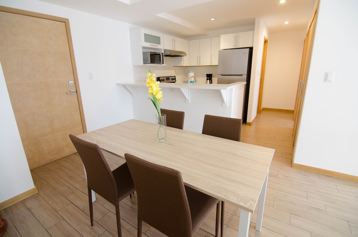 Vacker central lägenhet, nära de mest attraktiva platserna i staden, utmärkt läge, mycket nära till köpcentra, livligt område, etc. Lägenheten är utformad för att vara bekväm och få dig att känna dig som hemma, utrustad för familjer, grupper av vänner. Byggnaden är mycket säker, den har en lounge på 16:e våningen för att njuta av utsikten över staden, gym och en park på taket för att njuta av utomhuslivet, lekplatser för barn och arbetsområden. Välkommen!