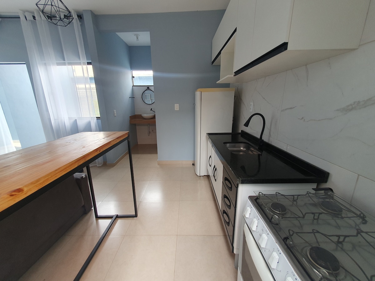 Mysig studio i Santa Cruz de Minas, bara några minuter från Tiradentes och São João del Rei. Perfekt för upp till 4 personer, med en dubbelsäng, bäddsoffa, utrustat kök, privat badrum, Wi-Fi, TV, fläkt och parkering (2 små bilar eller 1 stor). Nära till marknader och turistattraktioner. Perfekt för par, familjer eller vänner som letar efter komfort och funktionalitet.