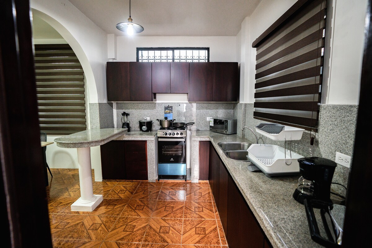 Vår privata, ljusa, rymliga lägenhet är centralt belägen i Puerto Ayora nära Darwin Avenue. Restauranger, butiker, Darwin Station och huvudpassageripiren ligger bara några minuters promenad bort. Lägenheten är utrustad med wifi, stort kök med kylskåp, induktionshäll och mikrovågsugn, och ett stort gemensamt område. Det är bra för par, familjer eller små grupper. Det finns två sovrum med luftkonditionering och bäddsoffor så att en familjegrupp enkelt kan rymmas. Uteplats tillgänglig på övervåningen.