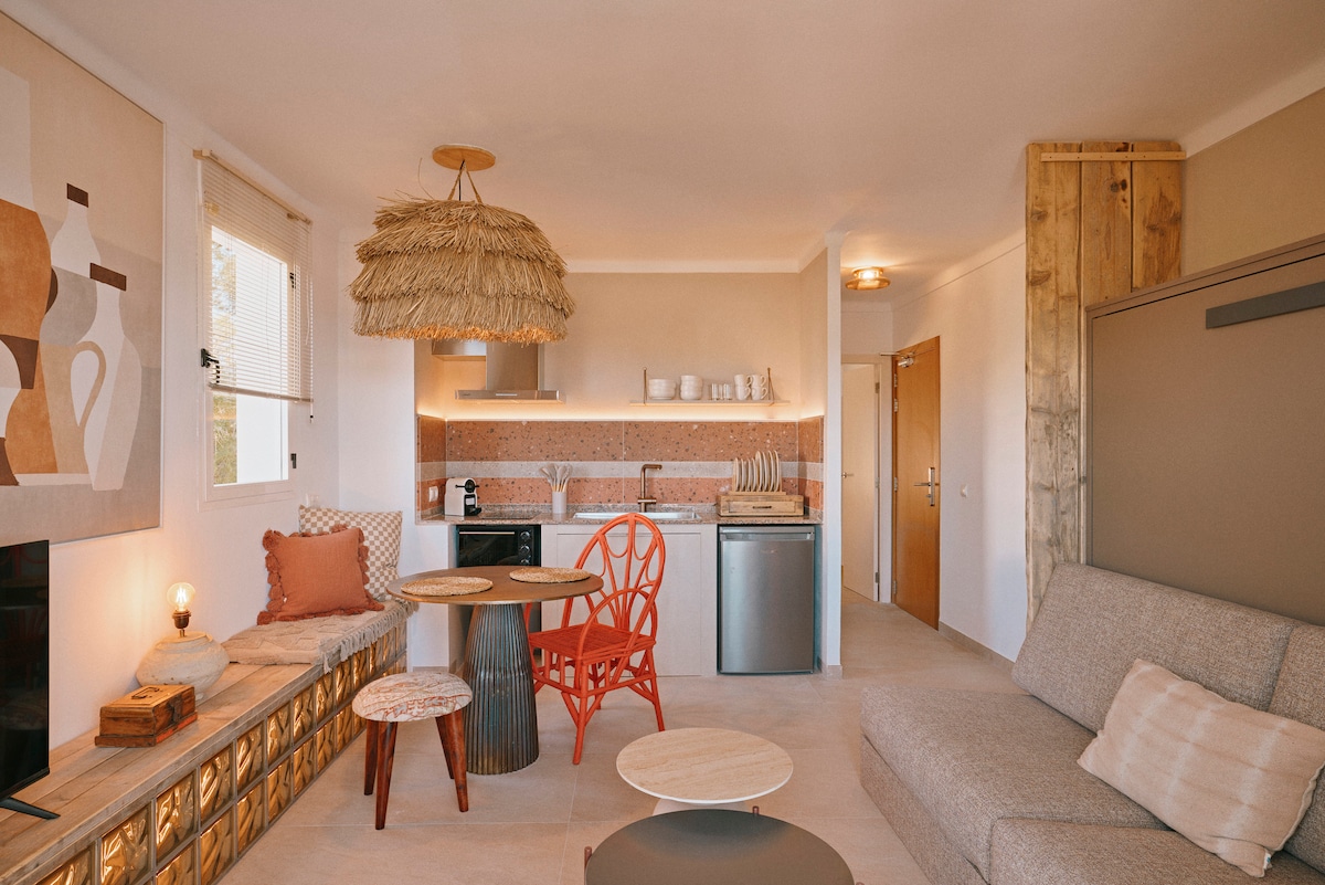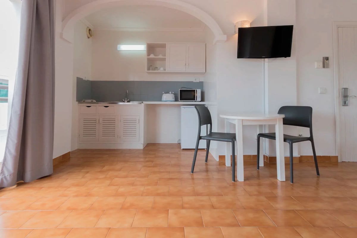 Studio på ca. 18 kvm, ljus och bekväm, med privat balkong, bara 350 m från stranden i hjärtat av Santa Eulalia. Rymmer upp till 3 gäster (2 enkelsängar + 1 hopfällbar säng). HUSDJUR tillåtna på begäran mot extra kostnad Utrustning med luftkonditionering, gratis Wi-Fi, TV, privat badrum och utomhusbalkong. Boende UTAN KÖK (ingen spis eller pentry). Gångavstånd till restauranger, butiker och promenad. Vissa rum har dusch, andra har badkar – tilldelas slumpmässigt vid incheckning.
