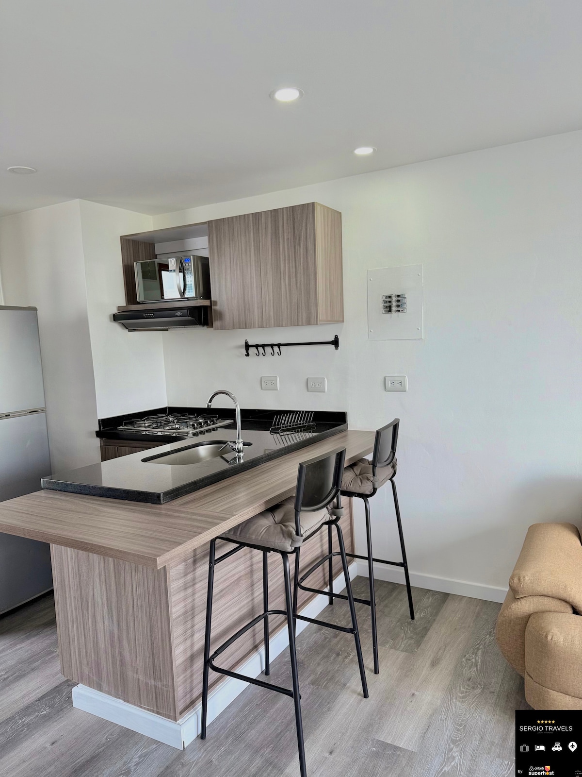 Njut av en elegant upplevelse i detta centrala, moderna och lyxiga boende, ge dig själv en varm och inbjudande vistelse i ett utrymme designat för dem som förtjänar det på den bästa platsen i staden. Vardagsrum med bäddsoffa och socialt badrum, arbetsområde, wifi, matsal, kök, klädområde, sovrum med badrum Förutom din komfort kommer du att vara nära stormarknader, köpcentra, restauranger, parker, apotek, barer, kaféer, kollektivtrafik och linbana.