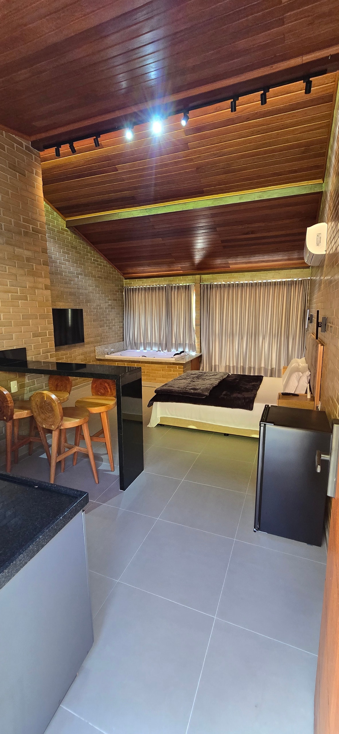 46 m2 stuga, rymmer perfekt ett par. Queensize-säng, badkar, smart TV, Alexa, Wi-Fi, varm/kall luftkonditionering, elektroniskt lås. Minibar, spishäll, mixer, mikrovågsugn, kaffebryggare, vattenfilter. Tallrikar, bestick, glas, koppar, kastruller, stekpanna. Vi tillhandahåller socker, olivolja, salt och kaffe; Hårtork och handdukstork. Premium sängkläder och badlakan, badrockar, bekvämligheter. Däck med utsikt över bergen, perfekt för avkoppling och njutning av den omgivande naturen.