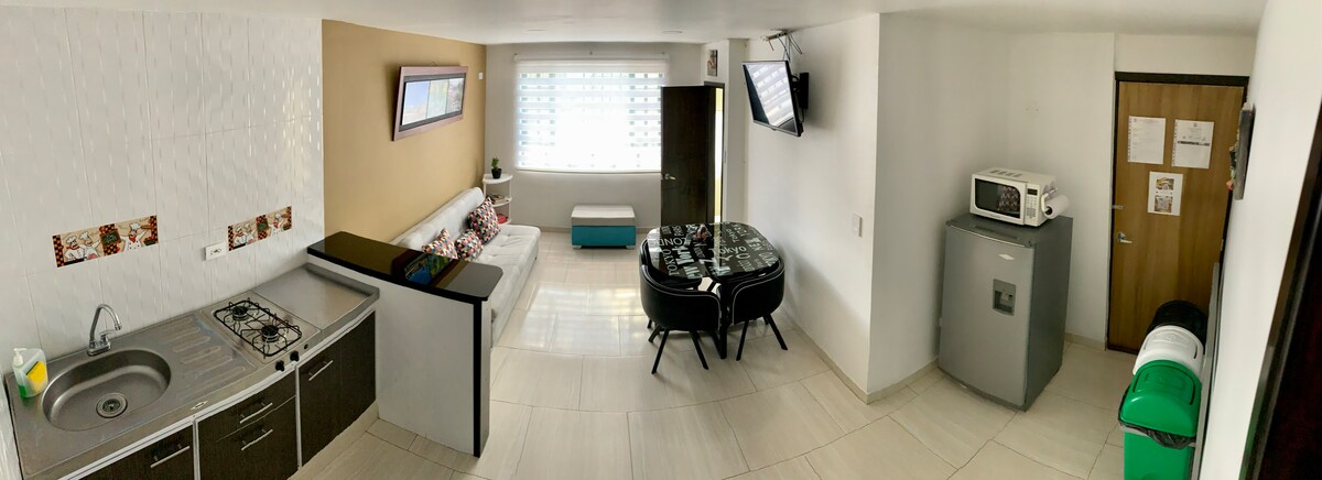 Ny studio, perfekt för familjer, belägen i ett bostadsområde, nära restauranger, banker, stormarknader, gym och de viktigaste klinikerna i Bucaramanga (foscal, Fosunab, Cardiovascular). Studion har 1 stort sovrum med dubbelsäng, 1 badrum med elektrisk dusch, bäddsoffa och ett vardagsrum med hängmatta, integrerat kök, våtzon, amerikansk bar, köksredskap, arbetsområde med wifi 150 mbs, 2 Smart TV och Netflix.