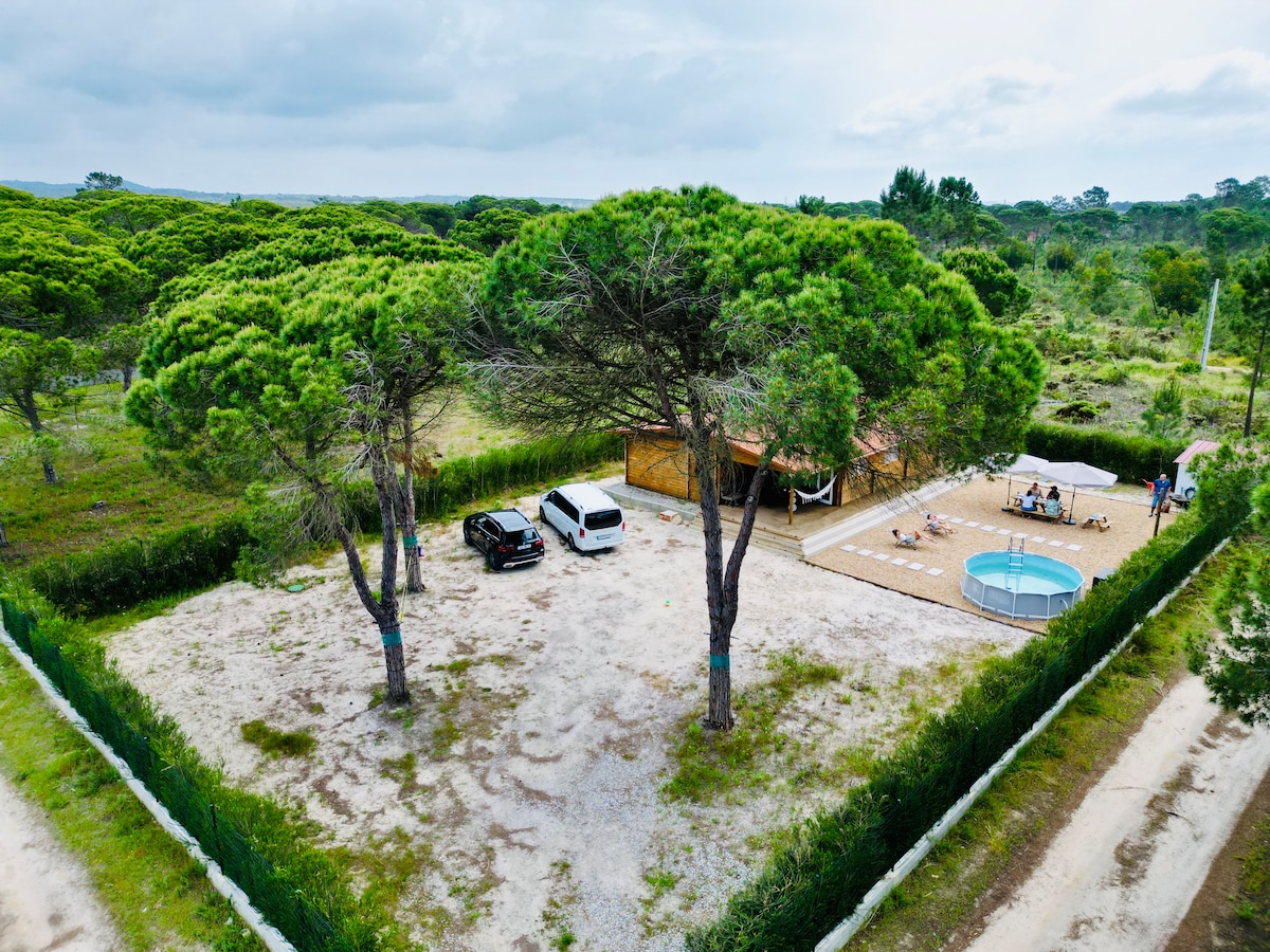 Känn dig som hemma i denna nya alpstuga som ligger mitt i naturen mellan stränderna och lagunerna Melides och Santo André. Stugan är perfekt för familjer och vänner, även fyrbenta, vill bo nära staden och stranden, med lugnet på landsbygden. Stugan har allt du behöver för en trevlig vistelse.
