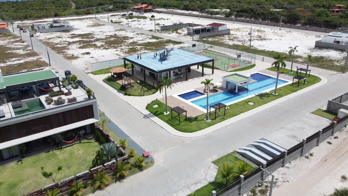 Casa Aconchegante, beläget inom Condomínio Dunas Park, 4 sviter: 2 med vändbart badrum och balkonger, sängkläder och badrum, alla med luftkonditionering, elektriska duschar, skåp och hängmatta. Full pool: spis med ugn, luftkokare, mixer, kastruller, vattendrickare, grill, köksskåp och stort matbord. Vardagsrum: soffa med TV. Fritidsutrymme:med egen pool, solstolar, dusch och nätägare.