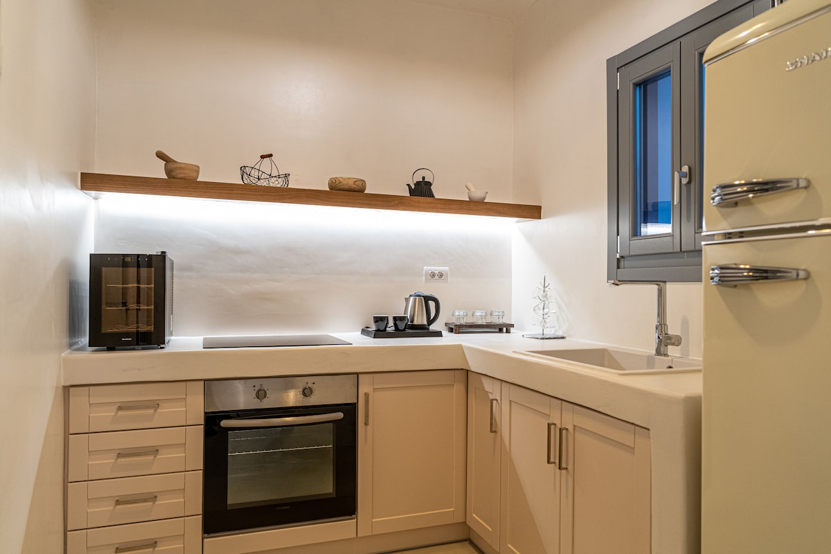 Denna exceptionella villa är 75 kvm, ursprungligen byggd inuti vulkanisk jord har nu rekonstruerats med en lyxig modern futuristisk twist. Denna unika egenskapen med sitt innovativa utrymme och surrealistiska konstruktion förkroppsligas med ljudrörelse och visuell essens. Villan består av ett fullt utrustat kök och matplats/vardagsrum med utsikt över en berusande vulkanisk utsikt och fridfull fascinerande havsutsikt.