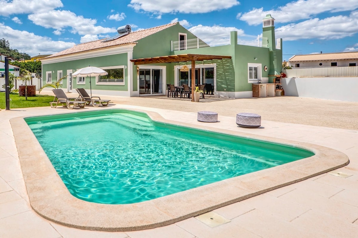 Villa med moderna linjer, i ett lugnt område, intill Algarvevägen med 3 sovrum och en svit med privat badrum, kök, vardagsrum, 3 wc, fullt utrustad, pool med trädgård runt, som förmedlar idealisk ro till vila, grillplats och utomhusbord. Perfekt för den som vill njuta av en lugn semester, vare sig i grupp eller individuellt i naturens sköte eller njuta av de underbara Algarve stränderna.