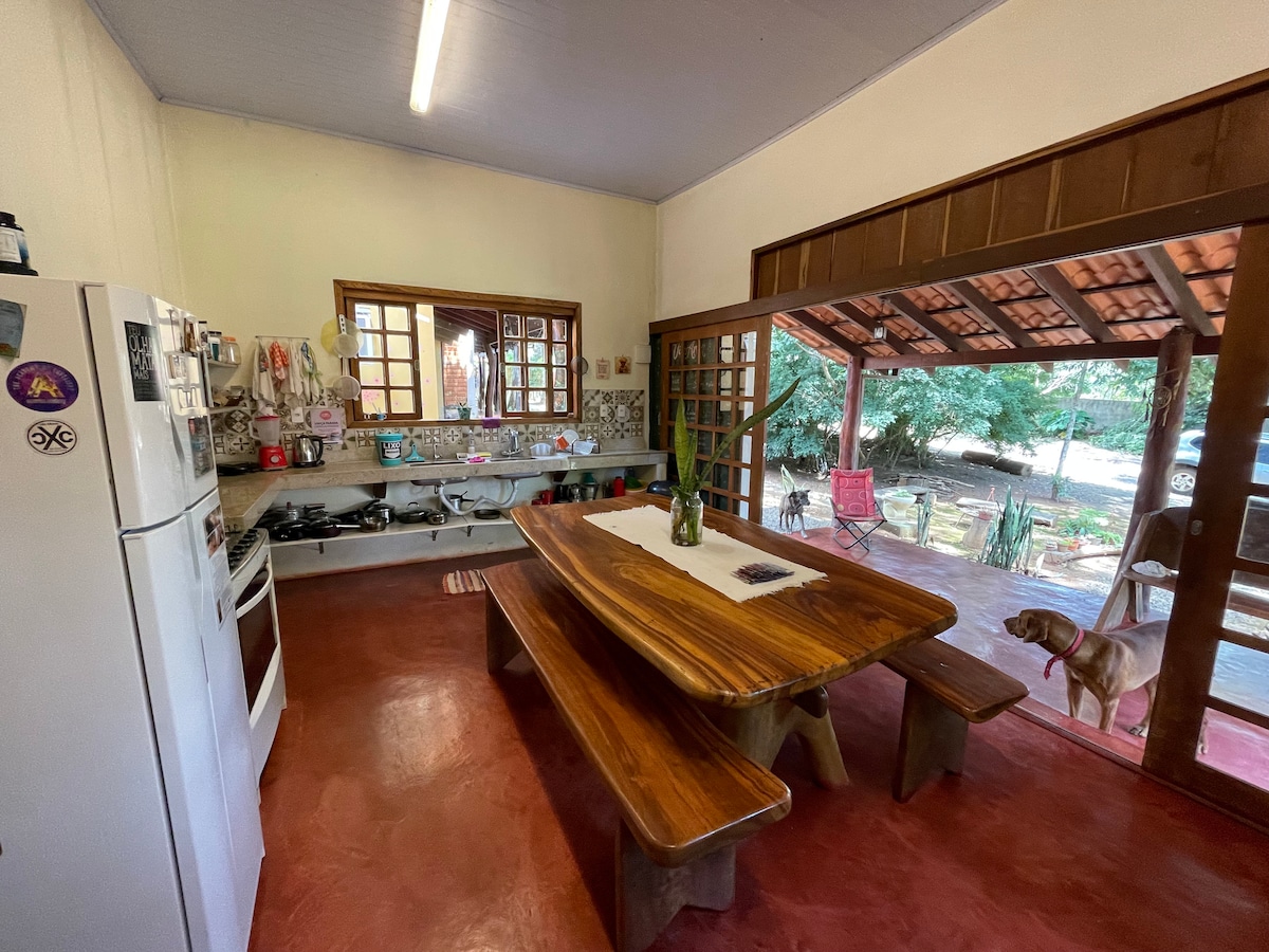 Välkommen till Vila Amor Privilegierat läge: Bara 50 meter från Alto Paraísos livliga huvudgata. Du kommer att vara en kort promenad från charmiga butiker, läckra restauranger och alla bekvämligheter som staden erbjuder. Och oroa dig inte, vi är bara 10 minuters promenad från busstationen om du kommer med buss! Vårt gemensamma kök är den perfekta platsen för att träffa andra resenärer, dela historier och erfarenheter, och laga din egen mat om du vill.