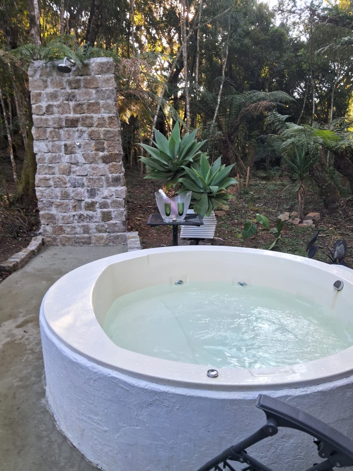 Cabana Encanto da Natureza är en 57 m² reträtt med integrerade miljöer och gott om naturligt ljus. Byggd 2,30 meter från marken erbjuder den den unika känslan av att vara i en trädkoja, omgiven av grönska. Perfekt för vila och kontakt med naturen, det har en bubbelpool för avkoppling och luftkonditionering för total komfort. Kapacitet: 1 par (2 personer).