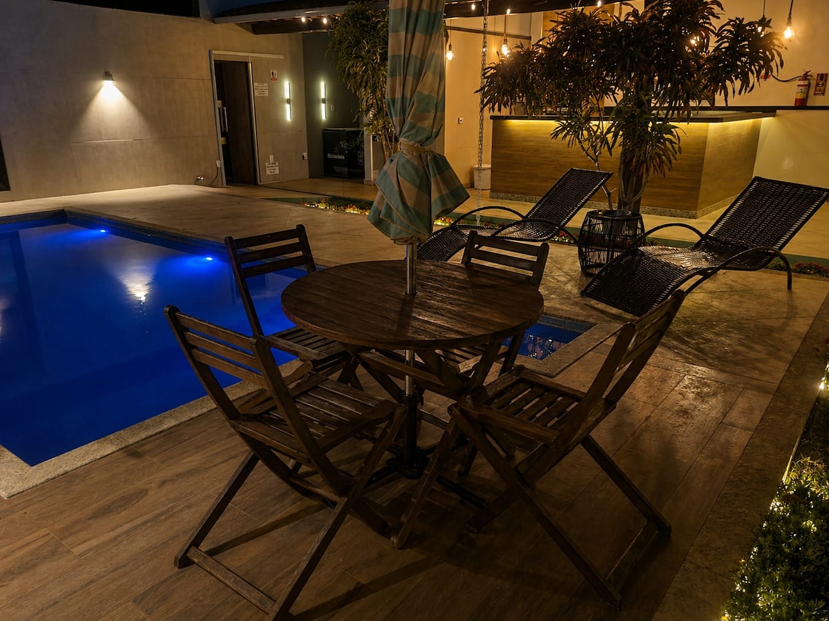 Bekväm Duplex 1,3 km från stranden. Perfekt plats för avkoppling, lugn och tyst gata. Boendet erbjuder 3 sovrum med luftkonditionering, Wi-Fi, 65-tums TV i vardagsrummet och 50-tums i sovrummen; Netflix, privat pool, grillplats, perfekt för att rymma upp till 10 personer. Det har också en utomhusspis, frys, grill, lerkrukor, plogskiva, bland andra, redo för samexistens vid bordet, vilket ger praktiskhet och underhållning. Allt detta tänker på dig.