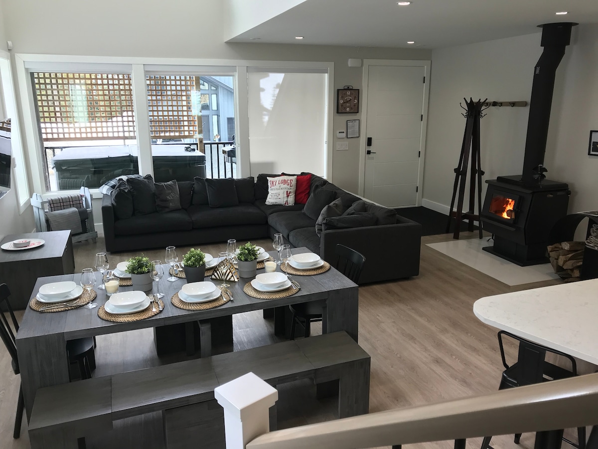 Njut av en elegant upplevelse pÄ detta centralt belÀgna boende. Sovplatser 4 bekvÀma (queen size sÀng, en queen utfÀllbar soffa, dubbel luftmadrass) 55 tum smart TV/gratis Wifi/TV Box (alla sportfilmer-netflix), bluetooth soundbar (vardagsrum och badrum), brÀdspel, vedeldad öppen spis, grill. Ski in Ski Out/pub/restaurang inom gÄngavstÄnd, vackra vandringar, mountainbike, ATV, fantastisk utsikt och sjöar i nÀrheten, pool (sommarsÀsongen)/bubbelpool/bastu (alla Är runt), bekvÀmlighetsrum och spelrum