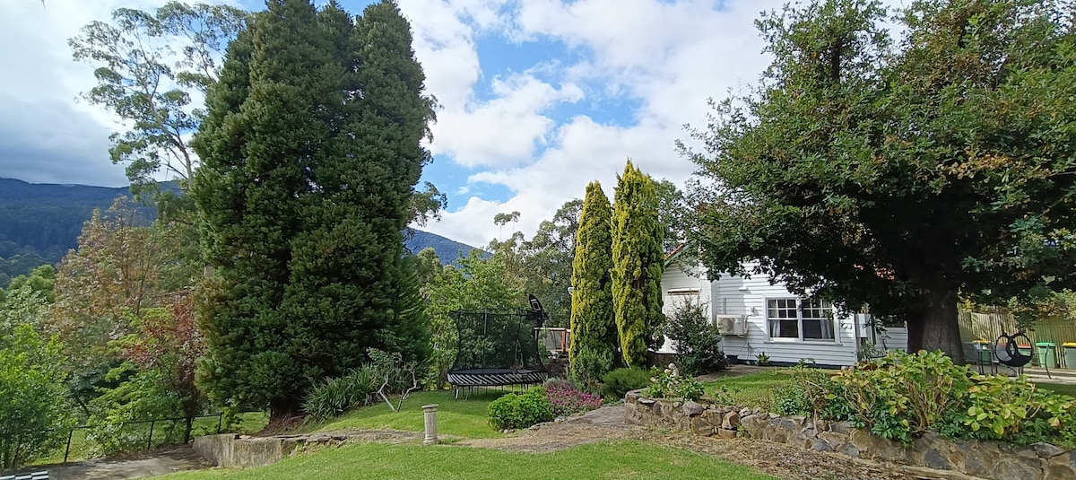 Underbar, karaktärsfylld stuga med öppen kamin. Fantastisk utsikt över bergen och trädgårdar. Gångväg till Warburton Rail Trail, Yarra River och Launching Place Hotel. Nära till kaféer, vingårdar, Healesville Sanctuary, Mt Donna Buang, och alla Yarra Valley erbjuder. Vi bor i ett separat boende på plats - här för att hjälpa till vid behov men kommer inte att avbryta din avkopplande vistelse. Chatta med våra vänliga hundar, får, ankor och höns Observera – vid katastrofala brandriskdagar kan din bokning behöva avbokas