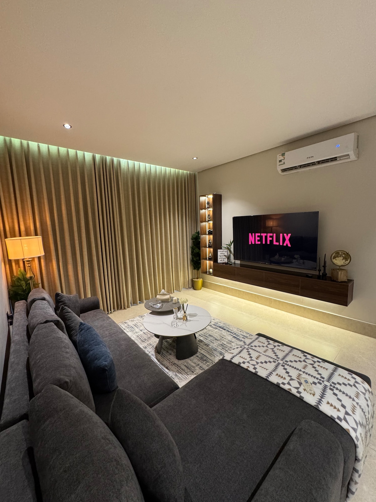 Lägenheten har ett mysigt sovrum med en lugn atmosfär som är perfekt för djup sömn, samt ett eget badrum för en unik avkopplande upplevelse efter en lång dag. Det finns också ett separat badrum utrustat med allt du behöver. I hjärtat av lägenheten hittar du ett rymligt vardagsrum med en bekväm soffa, perfekt för avkoppling eller för att titta på dina favoritfilmer, tillsammans med en elegant bar som ger en underbar modern touch och gör utrymmet idealiskt för att tillbringa kvalitetstid. • Privat parkering. • Gratis höghastighetsinternet som är lämpligt för arbete och underhållning • Exklusiva möbler och elegant design • En lugnande och avkopplande miljö