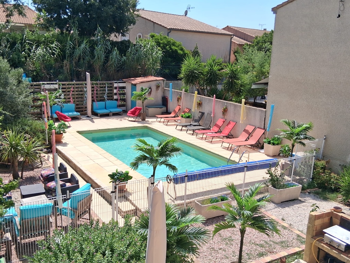Välkommen till höjden av Narbonne, där du kan njuta av en villa utan grannar, en trevlig trädgård med pool och grill i skuggan av en majestätisk tall som ger dig en medelhavsatmosfär som främjar avkoppling och gemytlighet. Trädgården är helt inhägnad och landsbygden ligger i närheten, du kan komma med dina husdjur. Huset är bekvämt och dess 125 m2 erbjuder ett perfekt utrymme för din semester med familj eller vänner.