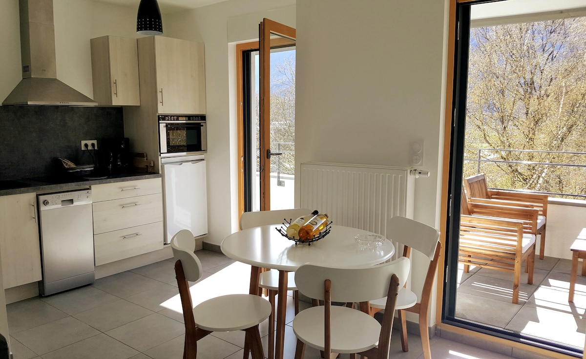 Ny enrumslägenhet, mycket nära sjön Aix-les-Bains, mycket ljus med sina 15m2 loggia orienterade västerut. Lägenheten på 45 m2 innehåller ett sovrum, ett vardagsrum (med bäddsoffa) inklusive kök och badrum. Det är på tredje våningen med hiss, tillgänglig för rullstolsanvändare. Det finns många barer och restauranger inom en fem till tio minuters promenad. Lägenheten rymmer från 2 till 4 personer. Garage. WIFI Bokning minimum: 21 nätter Perfekt för botemedel eller semester.