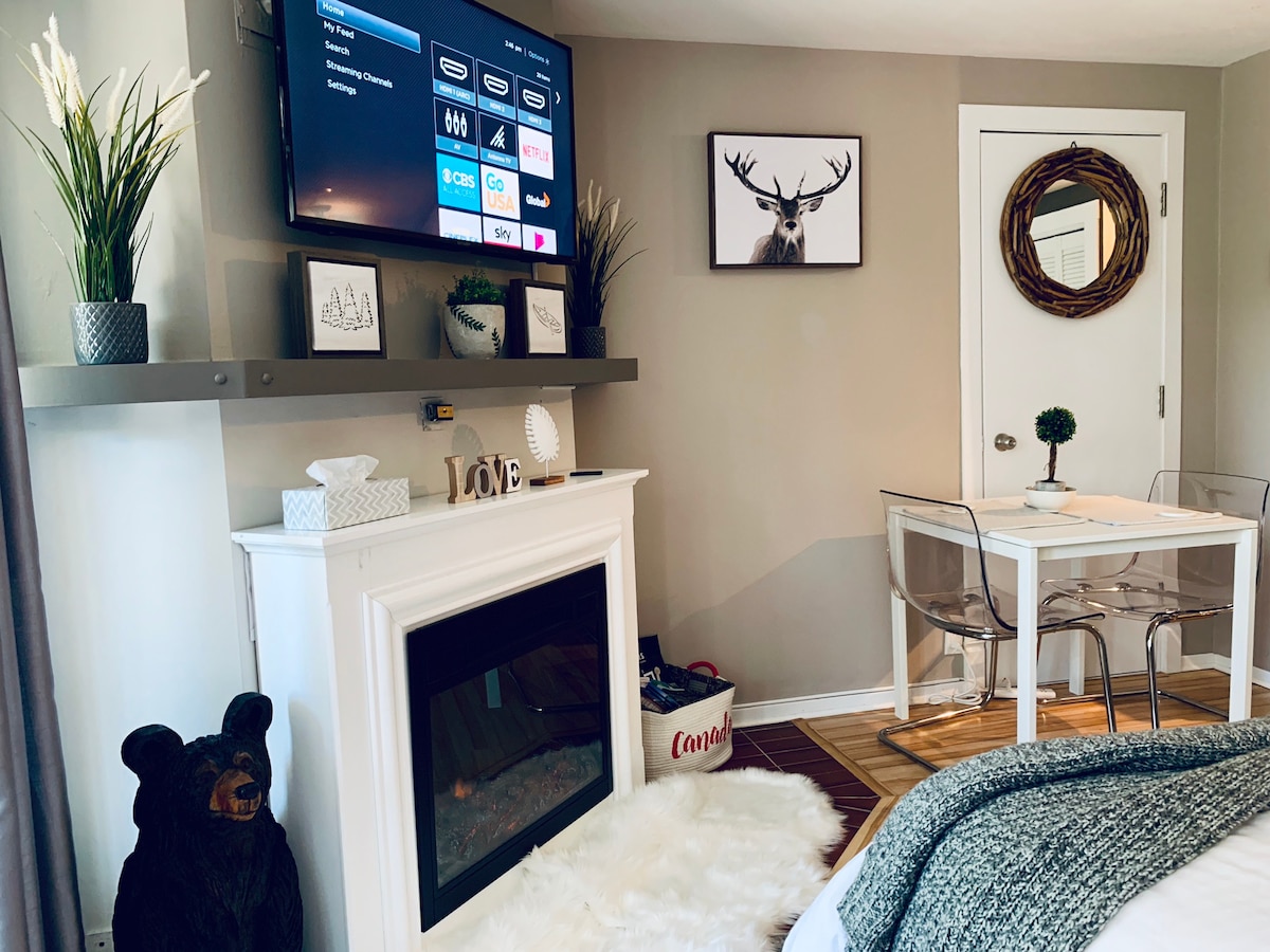 Denna vackra 340 kvadratfot stora studiolägenhet ligger i Gamla byn. Pool och bubbelpool öppnar i mitten av juni 🏊♀️🏊♂️ 2026 Allt renoverat och renoverat, fullt utrustat (fullt utrustat kök) är perfekt för en romantisk semester! Många restauranger och butiker samt Lake Mercier beach ligger mindre än 10 minuters promenad bort. Mont Tremblant suberbe ligger bara 8 minuters bilresa bort samt en fantastisk pool och spa.