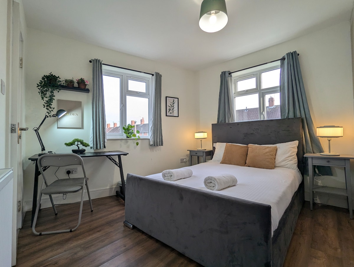 Great Location- If you are interested in a long stay .please get in touch. FREE parking. The whole house is for your use only. The lounge has ample seating , new very comfortable sofa, SMART tv and a dining area. Modern kitchen, dishwasher, oven, hob washing machine, freezer. Nice bathroom, double bedroom with comfy bed (EMMA mattress). Small outside covered seating area , washing machine and freezer. Also a small yard