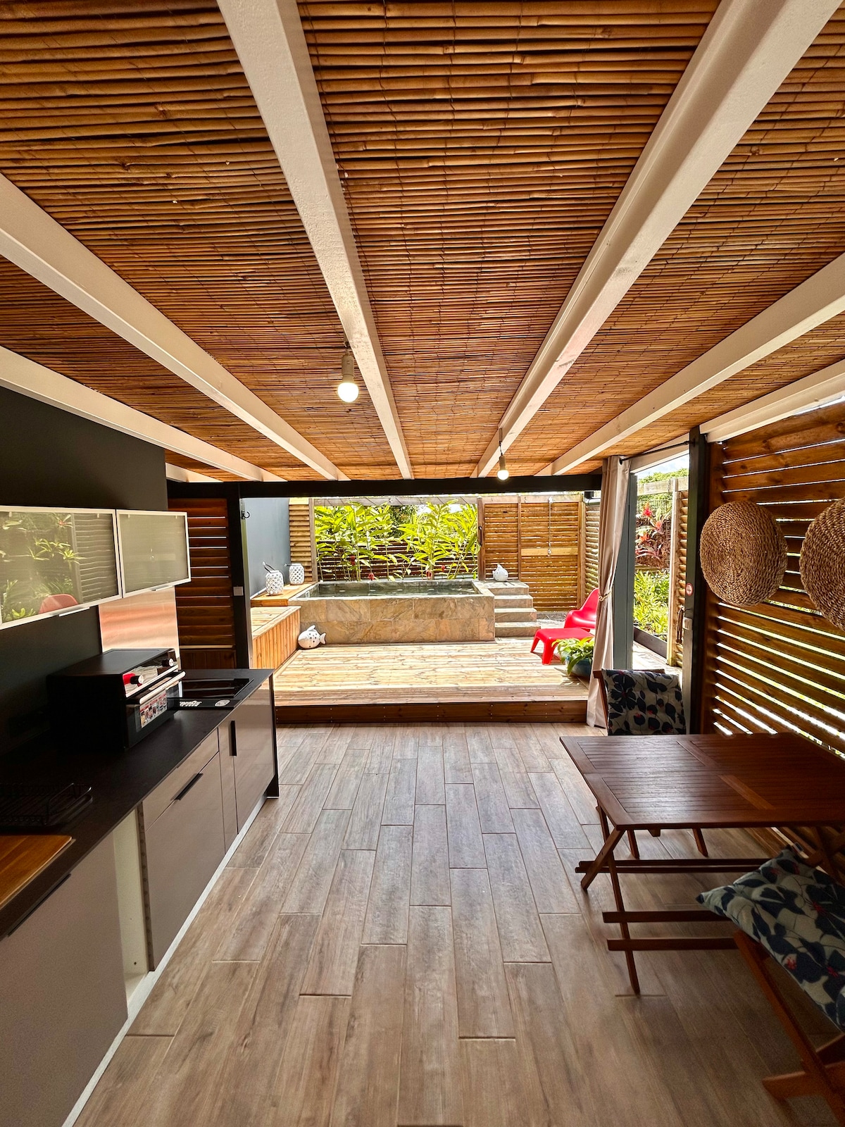 Koppla av i detta lugna och eleganta boende på höjderna av Fort de France. Du får ett ljust och ventilerat utrymme på nedervåningen i villan, med oberoende tillgång. Detta boende ligger på landet, i en grön miljö 10 minuters bilresa från centrum. Här finns ett snyggt sovrum och modernt badrum, stort privat vardagsrum med utsikt över en kreolsk trädgård. Du får tillgång till en privat kokvrå och matplats, vilket är perfekt för att njuta av dina luncher till ljudet av fågelsång.
