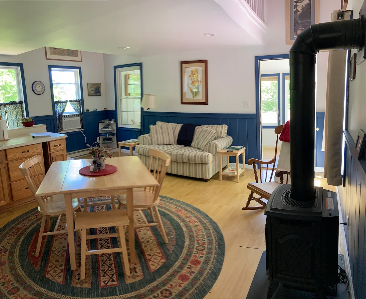 Upplev den förtrollande Misty Mountain Hideout, en oförglömlig tillflyktsort som rymmer upp till 4 gäster. Denna mysiga lägenhet (som är ansluten men separat från vårt hem) har en full storlek säng på övervåningen och en queen-size säng på nedervåningen och har ett kök/matplats och en privat täckt veranda. Beläget på 4 lugna hektar i västra Maine, njut av fantastisk utsikt över bergen, lugna dammar, rikligt djurliv och hisnande solnedgångar i hela boendet. Din perfekta semester väntar!