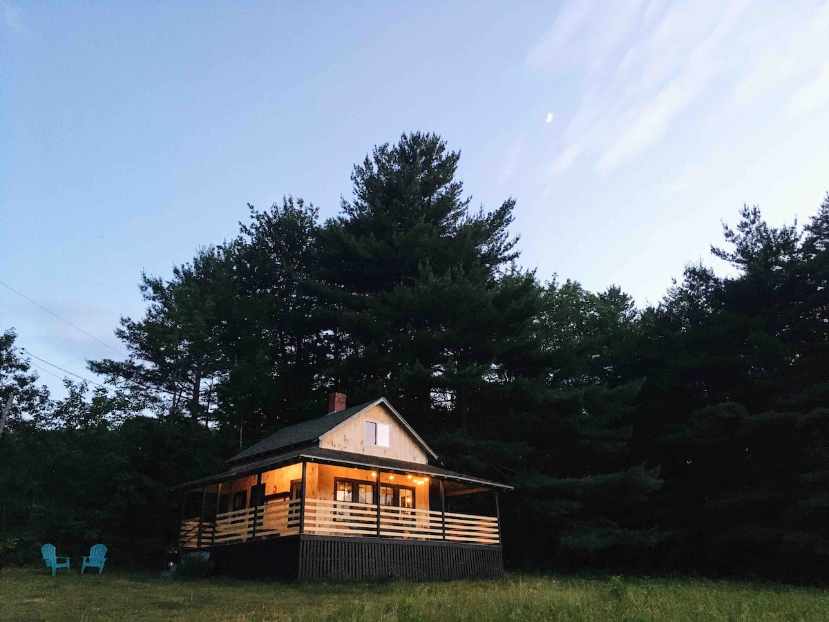 Utvald på Huckberry!! Vackert inredd säsongsbetonad konstnärsstuga med helt nytt badkar och utomhusdusch. Solo spis eldstad och Adirondack stolar. Enorm veranda med utemöbler och härlig solnedgångsutsikt över blåbärsfält. Också fantastisk stjärnskådning!! Nära Naples, Bridgton, Sebago Lake. Massor av sjöar i närheten, vandring, simning, båtliv, restauranger, musik och lokal öl! Bra ställe att bo på för att utforska området eller också bara koppla av och hänga.