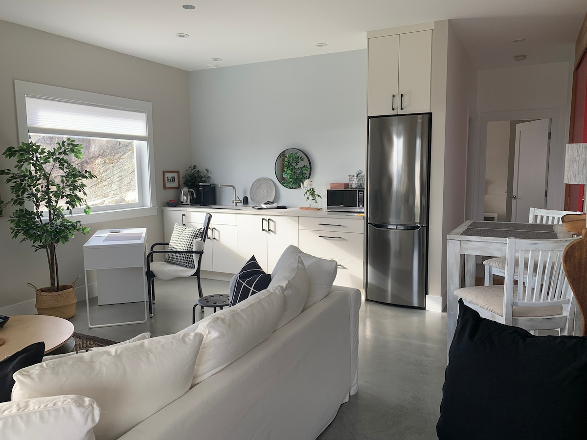 Vår licensierade svit med havsutsikt (byggd 2022) ligger centralt på Sunshine Coast i West Sechelt. Det är 5 minuters bilresa (20 minuters promenad) in till staden och busshållplatsen ligger 2 minuter från ytterdörren. Luta dig tillbaka och koppla av på den rymliga uteplatsen där du kan njuta av vår gaseldskål, Weber BBQ och trädgården efter en dags utforskning. Vår mycket privata svit med ett sovrum har en dubbelsäng, en utdragbar bäddsoffa, en smart 50-tums-TV, höghastighetsinternet via fiberoptik och luftkonditionering.