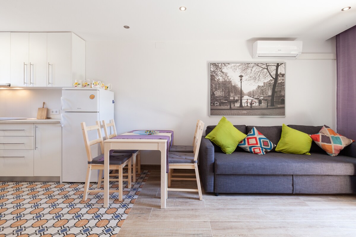 l CALAFELL 5 BEACH med WIFI och AC luftkonditionering, ljudisolerade fönster. Lägenheten 75 meter från stranden Calafell, med blå flagg. Den består av: 1 sovrum med dubbelsäng 150 * 190 och boxfjäder tempur, Air AC Fujitsu, full matsal, bäddsoffa 2 personer, hopfällbar och barnsäng park vid behov, pentry, badrum med dusch-WC och tvättmaskin. Lägenheten med en stor terrass på sjätte våningen med utsikt över hav och berg. Nöjesparker Port Aventura och Ferrari Land bara 40 km bort.