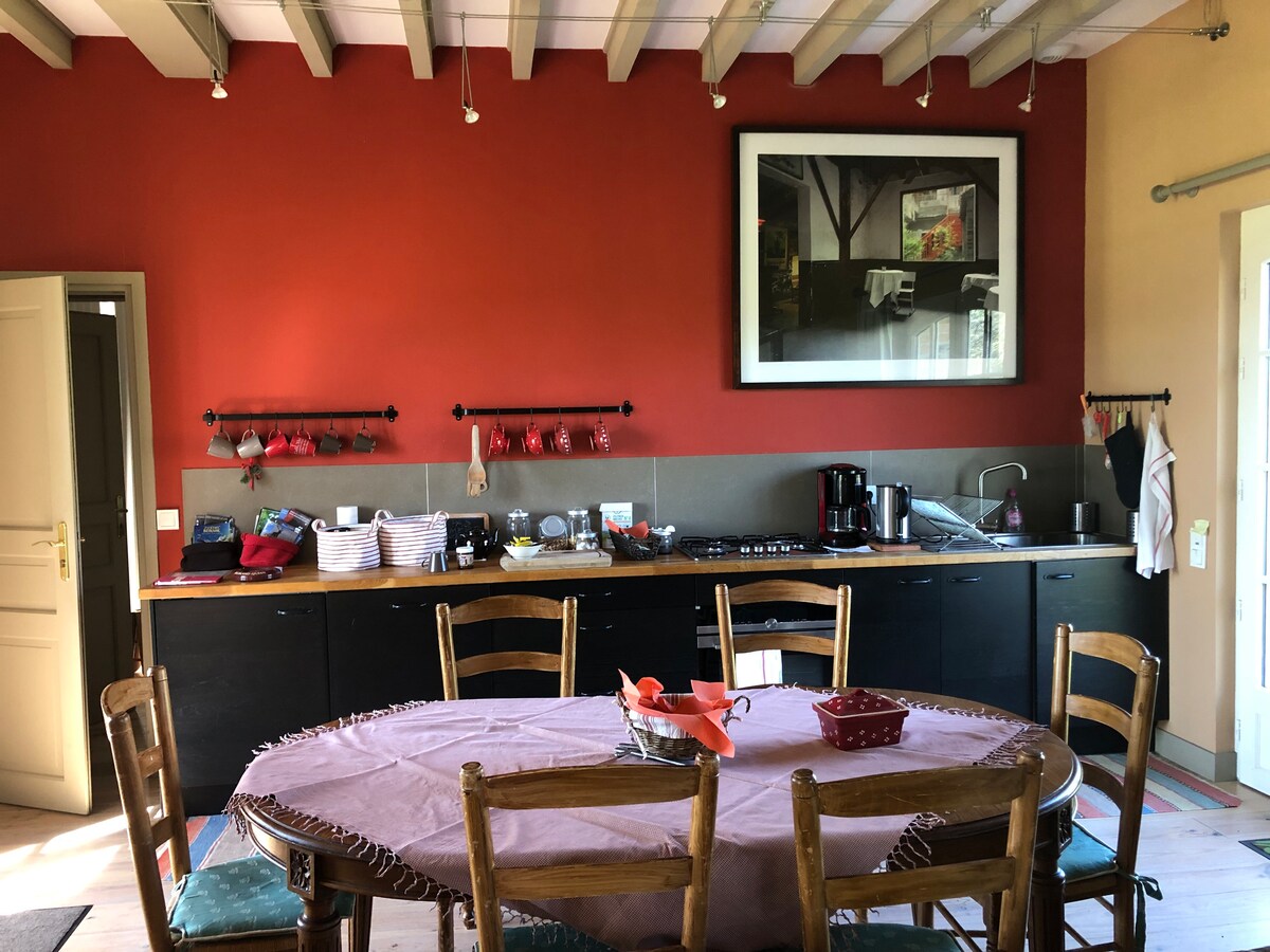 Hela andra våningen är för gästerna (55 m²): du kan bo på ett nästan oberoende ställe... inklusive 1 rum med en dubbelsäng (eller 2 enkelsängar) och eget badrum, och 1 konstnärsstudio omvandlad till vardagsrum med en säng för en annan gäst (+ 50 €). Badrummet delas. Frukost serveras på nedervåningen, på morgonen vid den begärda tiden och ingår i priset på rummet. Värdarna Erik och Dominique bor på andra våningen. Det finns också cas som bor med dem
