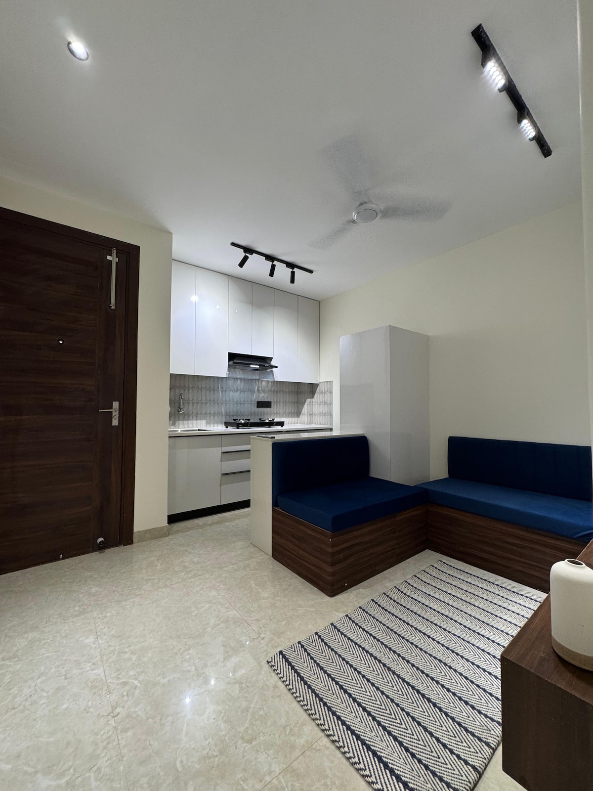 Upplev modernt stadsliv när det är som bäst i denna eleganta 1 BHK av zest.living Homes. Sänk ner dig i din säng, laga måltider i det fullt utrustade köket och koppla av med en film på Smart TV, allt i bekvämligheten av luftkonditionering. Njut av din privata balkong, höghastighets-Wi-Fi, säkerhet och strömförsörjning för total sinnesro. Beläget nära 54 Chowk Rapid Metro är detta den perfekta tillflyktsorten för upptagna proffs som söker en premium, problemfri vistelse. Gör din stadsresa till en Zestful!