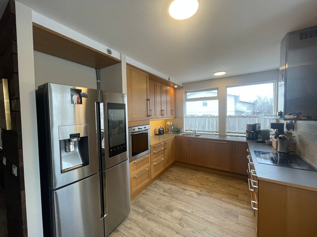 Vårt hem byggdes 2015, och ligger i den östra delen av Reykjavík. Huset är öppet och ljust på en våning, 170 m2 med en stor bakgård. Bra gratis (24/7) parkeringsplats framför huset, och busshållplats vid huset, bara 15 minuter till centrum. Huset har 3 sovrum, 2 kingsize-sängar, 2 enkelsängar och 1 spjälsäng. Gratis trådlöst internet. Det är elegant möblerat och har fullt utrustat kök. Sänglinne och handdukar tillhandahålls. Norrskenet kan ses från vår bubbelpool.