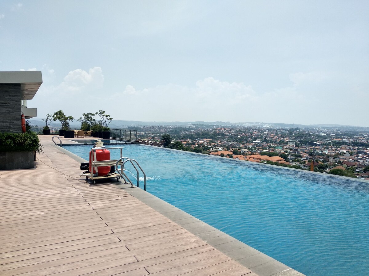 Beläget i centrala Semarang Simpang Lima. Denna studiolägenhet är fint inredd med full bekvämligheter. Vacker utsikt över Simpang Lima från lägenheten. Mycket bekväm säng med stor ny 55" smart-TV, kastruller, kokkärl, porslin, mikrovågsugn och kaffe tillhandahålls. Badrum, pool och restaurang på taket. Hundratals restauranger och stora köpcentrum mittemot hotellet.