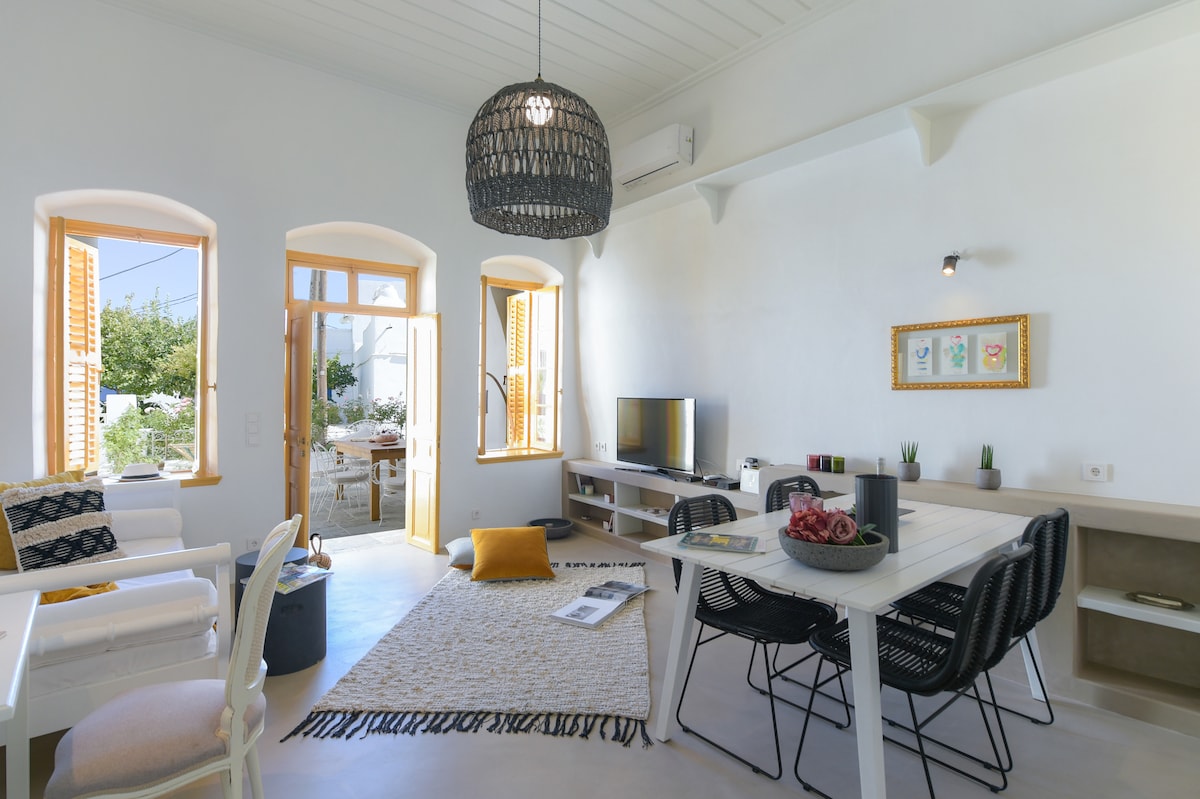 Ett charmigt historiskt kykladiskt hus i hjärtat av Apollonia, med en separat studio som erbjuder extra avskildhet för familjer eller grupper av vänner. Boendet rymmer upp till 7 gäster med tre sovrum och tre badrum (två ensuite och ett privat badrum i studion). En perfekt bas för öutforskning och underhållning, några steg från pulserande Apollonia.