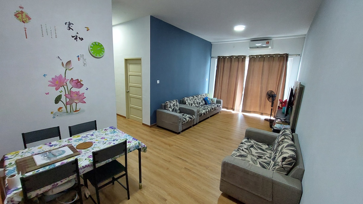 Vi ligger i ett lugnt och fridfullt bostadsområde, ungefär 5 minuters bilresa till Batu Kawa Riverbank Park & McDonalds; 20 minuter till Kuching flygplats & Kuching Waterfront. På promenadavstånd finns 24-timmars Hypermarket, 24-timmars KFC, Apotek, Klinik, Massor av lokal mat, Massor av shopping. Vi har pool och lekplats på plats. Vi tillhandahåller också välkomstsnacks för gäster som vi välkomnar till vårt hem. Ett av sovrummen är speciellt utrustat med leksaker och sängkläder som passar små barn.