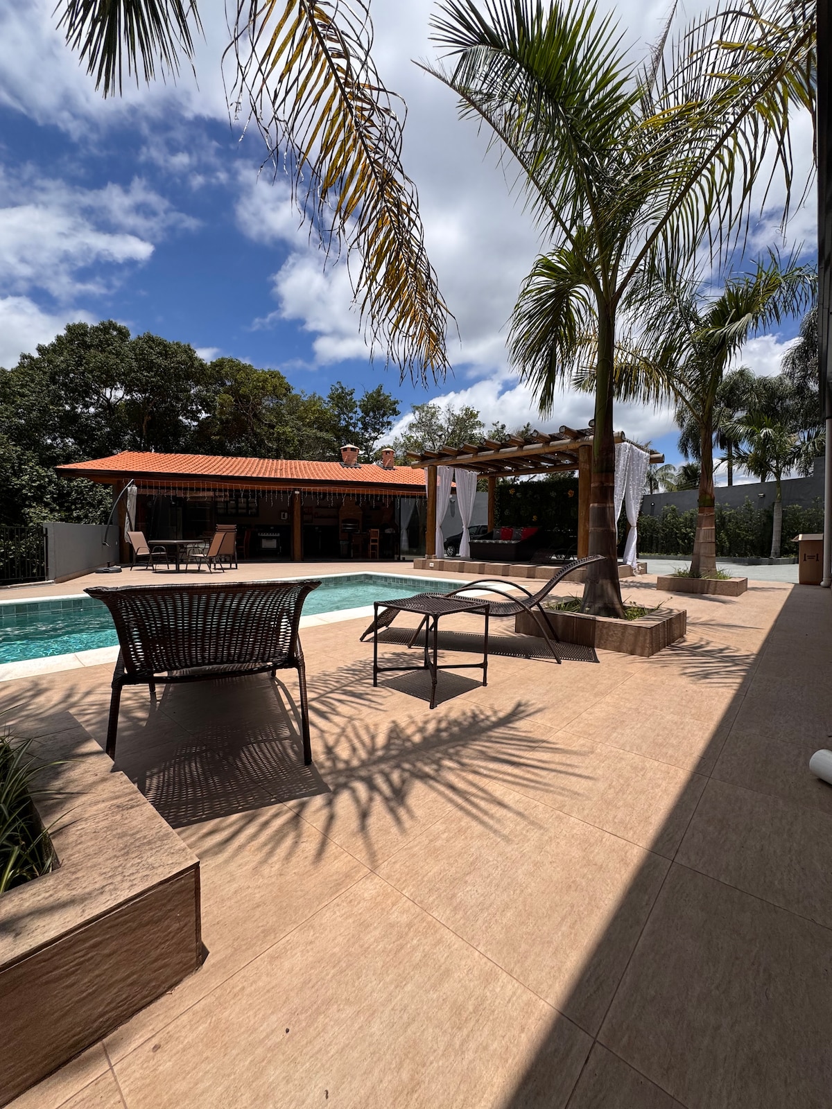 Fastigheten består av ett gourmetområde som har en grill, en vedeldad ugn, en pizzaugn, en TV, bord, en gasspis, en elektrisk ugn, en diskbänk och alla köksredskap. I samma utrymme finns också en toalett och ett badrum med dusch, och bredvid finns den dubbla sviten. Detta område vetter mot poolen. På nedervåningen finns tre sovrum med enkelsängar och badrum. Jag erbjuder TV-rum med Directv och HBO Fastigheten har inget slutet kök.