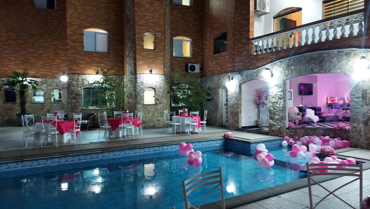 Med en vinterträdgård som delar utrymmena, kommer du att känna dig i ett hörn av avkoppling och underhållning, pool, spa, bubbelpool, ljudutrustning, kabel-TV med alla kanaler tillgängliga, öppen spis i de 2 rummen, behållare för eldstäder utanför, TV och stereo i sovrummen. Sängkläder och handdukar av högsta kvalitet. Fullt utrustat kök. Nära Shopping Eldorado och Iguatemi och 2 torg med massor av natur.