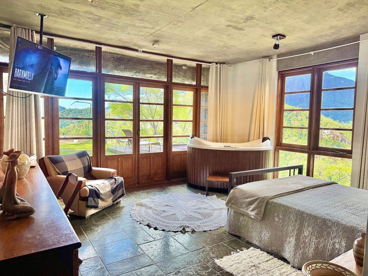 Upptäck den perfekta tillflyktsorten i naturen i Serra dos Órgãos nationalpark! Vår charmiga stuga erbjuder alla bekvämligheter för en avkopplande och oförglömlig vistelse. Vi har höghastighetsinternet (fiberoptik och Starlink), en generator för eventuella strömavbrott, samt ett komplett fritidsområde med ångbastu, grill, golvbrand och pool som delas mellan stugorna. För din sinnesro erbjuder vi parkering övervakad av kameror dygnet runt.