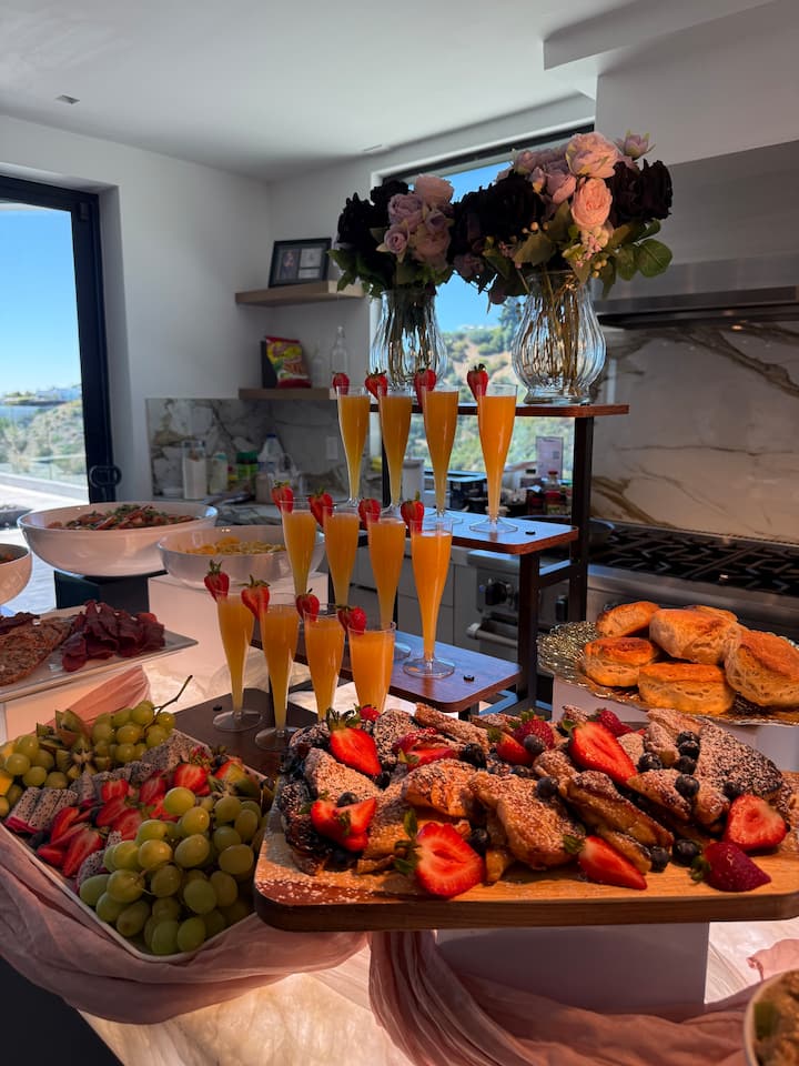 Denna brunch är utformad för att delas i miljöer som möhippor, brudduschar eller avslappnade sammankomster och inkluderar matlagning på plats, full uppsättning och service, och en själfull meny med erbjudanden som räkor och gröt, varm honung kyckling och våfflor, persika cobbler fransk toast, en kocks omelettstation, och ett mimosa torn.