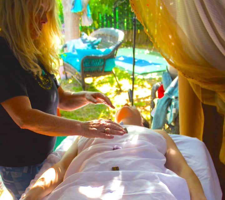 En avkopplande resa för 2, detta paket har en kombination av djupvävnads- och varm stenmassagetekniker, plus reiki. Behandlingen följs av ett aromatiskt bad med en serie naturliga, handgjorda produkter. Sessionen avslutas i den infraröda bastun, inbäddad i fruktträdgårdens lusthus.