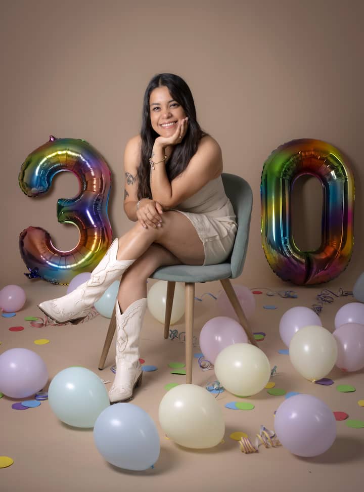 Födelsedagsfotografering inkluderar ballonger i den färg du väljer, numret i stor och en liten tårta som du väljer från vår katalog.