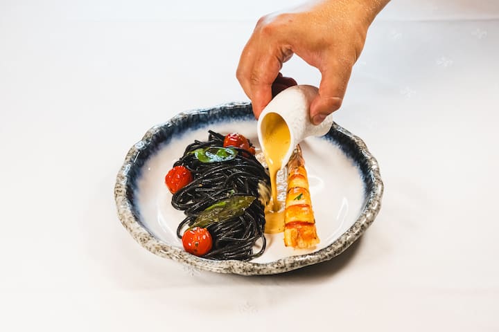 Upplev en hel måltid värdig ett stort bord: aptitretare, 2 förrätter, huvudrätt, ost och efterrätt. Färska produkter, kreativ mat och raffinerad service direkt hemma, för en unik och varm stund.