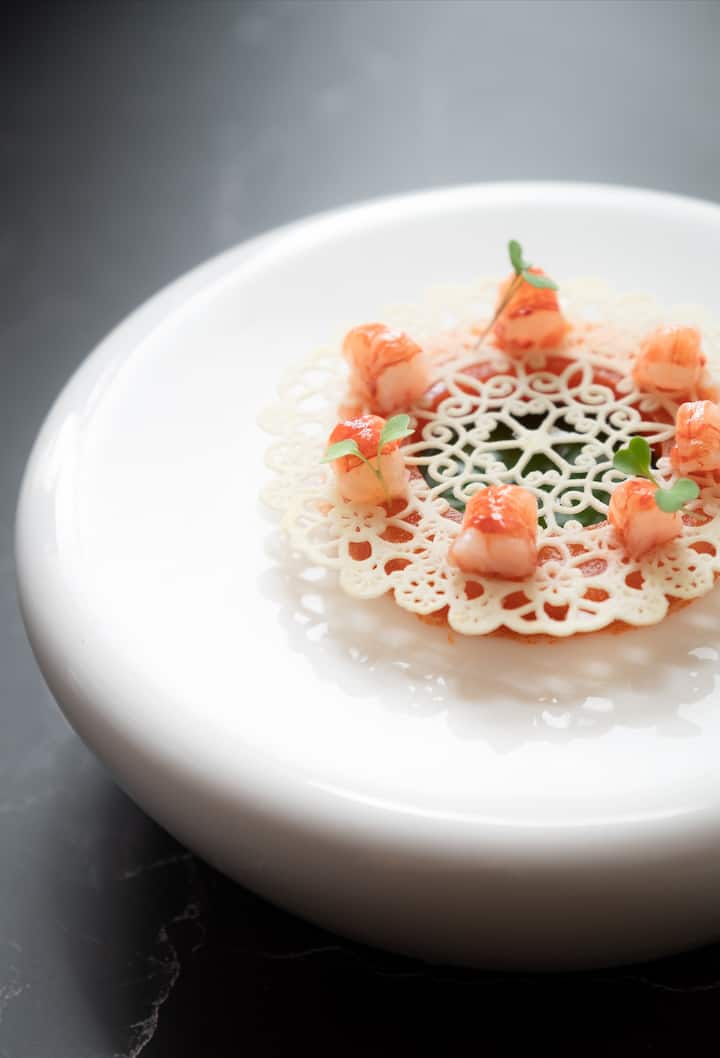 6-rättersmeny inklusive välkomstfingerfood med blå bläckfisk, havsabborre ceviche, röda räkor, risotto och tonfisktartar, amberjack och dessert