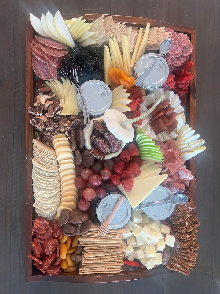 en elegant visning av diverse härdat kött och fina ostar. tillsammans med färska och torra frukter, sylt, honung, nötter, bröd och kex