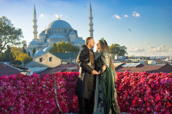 Njut av en oförglömlig fotoupplevelse i böljande klänningar, tillsammans med den fantastiska utsikten över Istanbul.